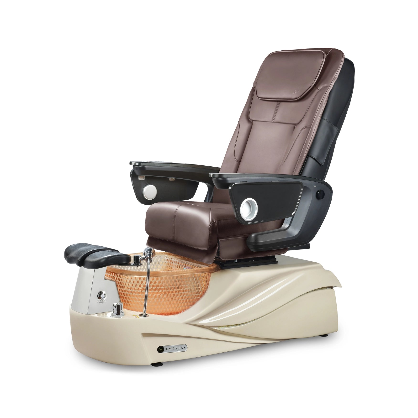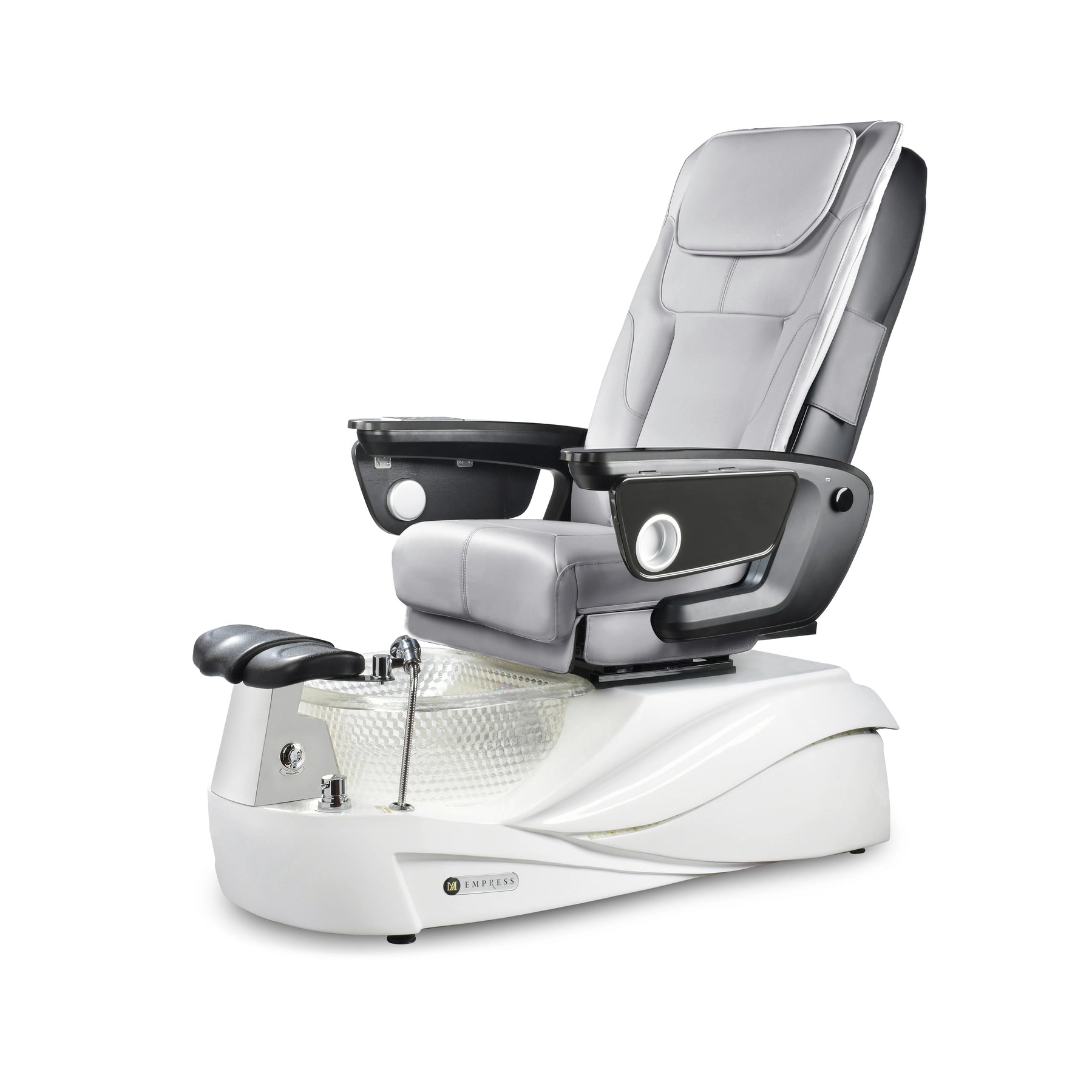 El spa de pedicura Empress RX impresiona a sus clientes. Los salones elegantes aprecian el sillón de pedicura Empress con todas las funciones por sus líneas elegantes, su construcción duradera, su rendimiento y su valor. Ofrece una experiencia de spa de primera categoría. El sillón de pedicura Empress impresiona aún más con su hermoso cuenco de resina, sus chorros limpios y potentes sin tuberías, su masaje shiatsu completo y su reposapiés de fácil ajuste, todo ello envuelto en una base con iluminación LED.
